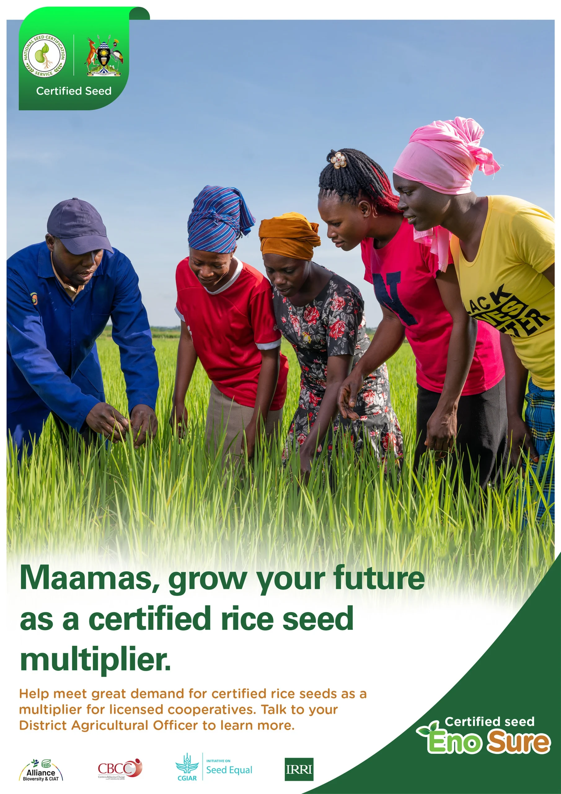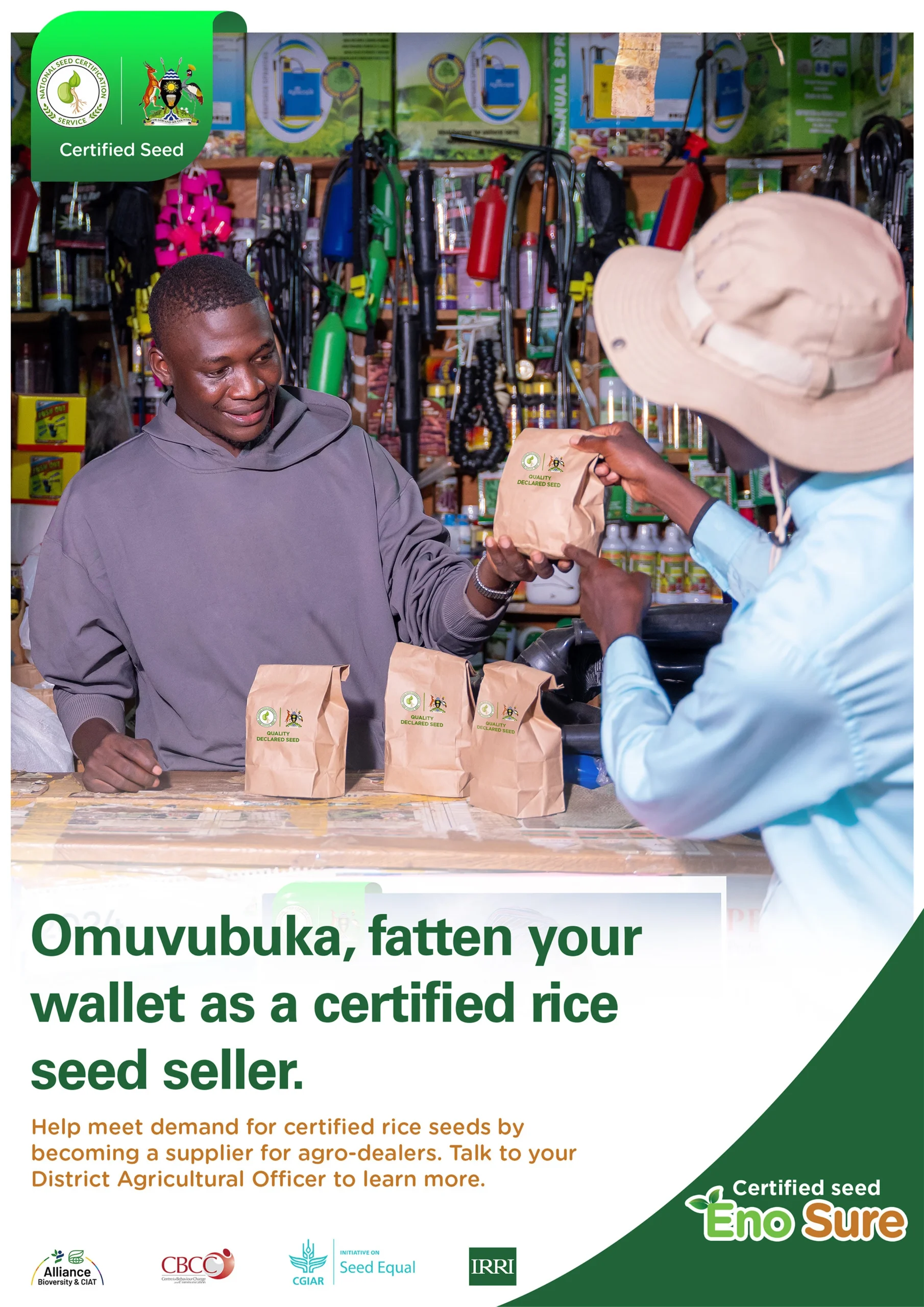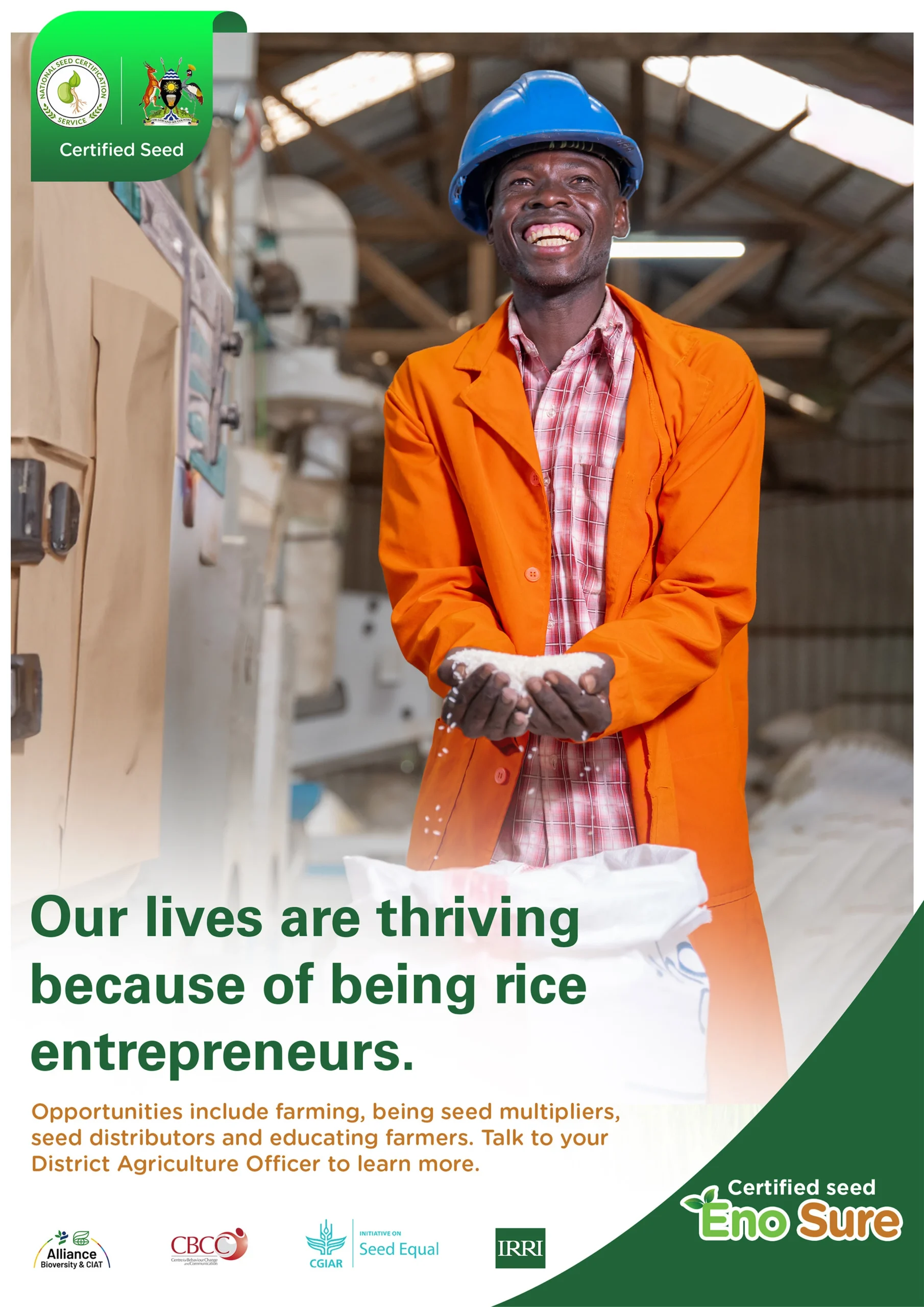 The Eno Sure campaign draws from a popular Ugandan slang meaning “it’s legit” to build trust in quality improved seeds just like trusted brands earn instant approval. In Butaleja, the campaign aims to make farmers, especially women and youth, feel confident that using improved bean and rice varieties will deliver reliable results. It promotes increased participation in seed production and enterprises by strengthening both formal and informal systems. The campaign also raises awareness of beans and rice as nutritious alternatives, while addressing barriers like gender and social norms to ensure equitable seed access among previously unreached smallholder farmers. The campaign is funded by Bill and Melinda Gates through International Rice Research Institute and implemented by CBCC in Butaleja Uganda.