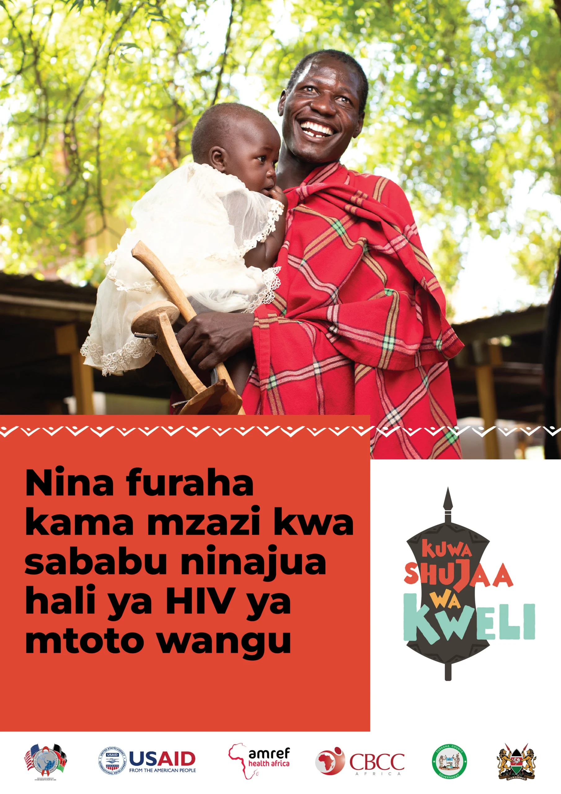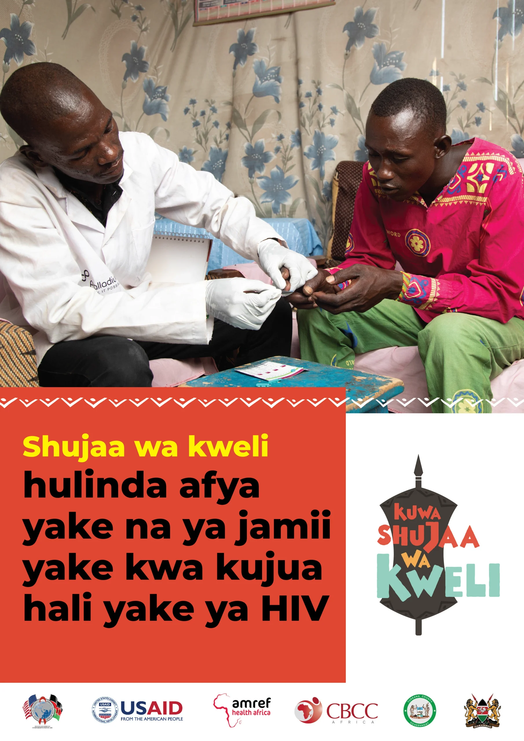 In Turkana folklore, Shujaas (heroes), are celebrated in songs and dances as protectors of the community. Traditionally, courage was measured by confronting wild animals, defending herds, or braving the harsh environment. But today, the greatest threats are not only external. They lie within the community itself: diseases that silently weaken families and futures. The Shujaa Wa Kweli campaign redefines heroism for a new generation. A shujaa (hero) is the man, woman, or youth who chooses to protect loved ones through health. At its heart is one powerful message: “The True Test of Courage” is getting tested for HIV. Because when you overcome this test, no other challenge can defeat you. Branding HIV testing as an act of courage, not fear. Shujaa Wa Kweli inspires a cultural shift in Turkana, heroes are no longer just warriors, but protectors who embrace health services for their families. The campaign is funded by PEPFAR and USAID and implemented by CBCC in partnership with Ministry of Health, the County government of Turkana, AMREF and other partners.