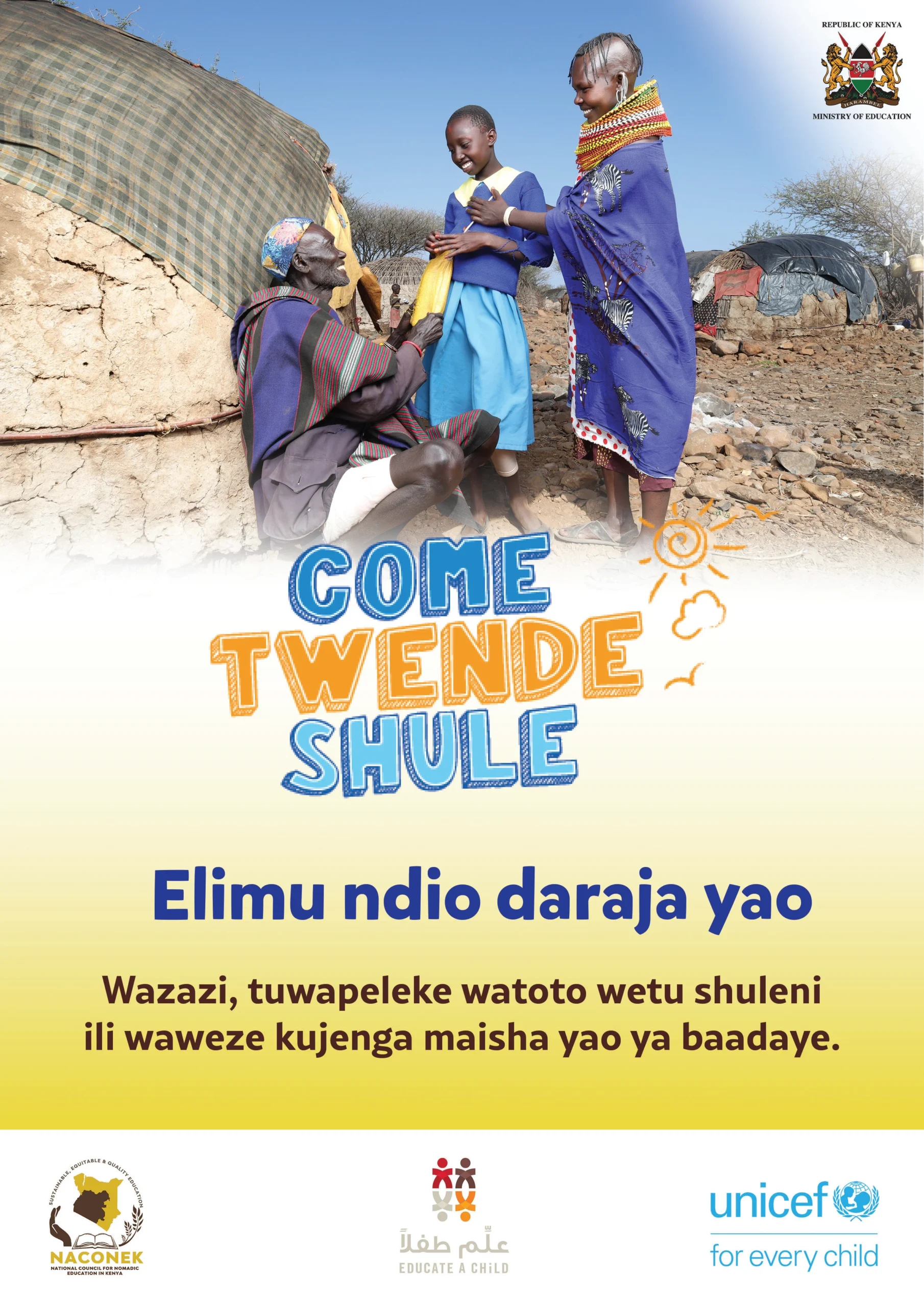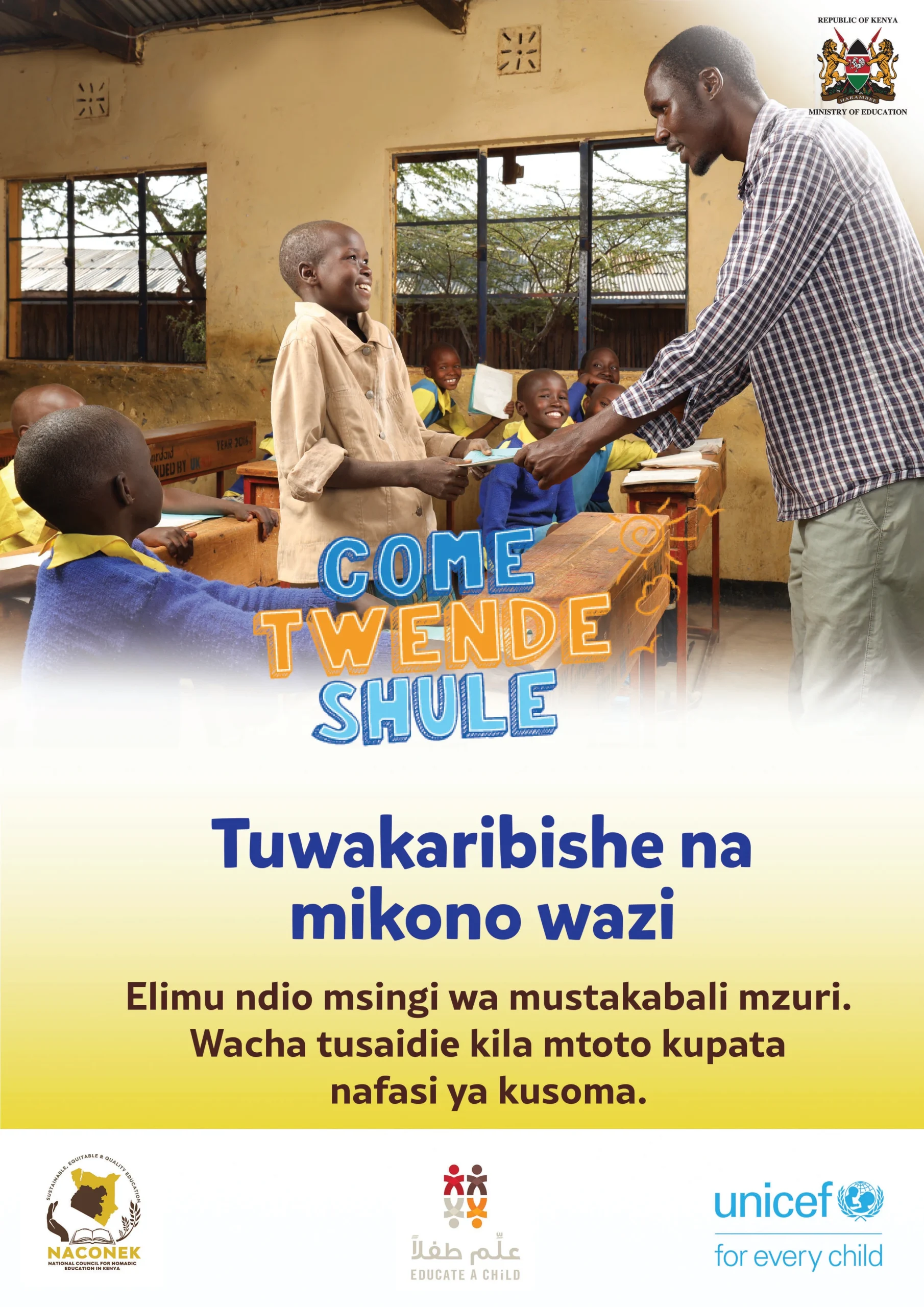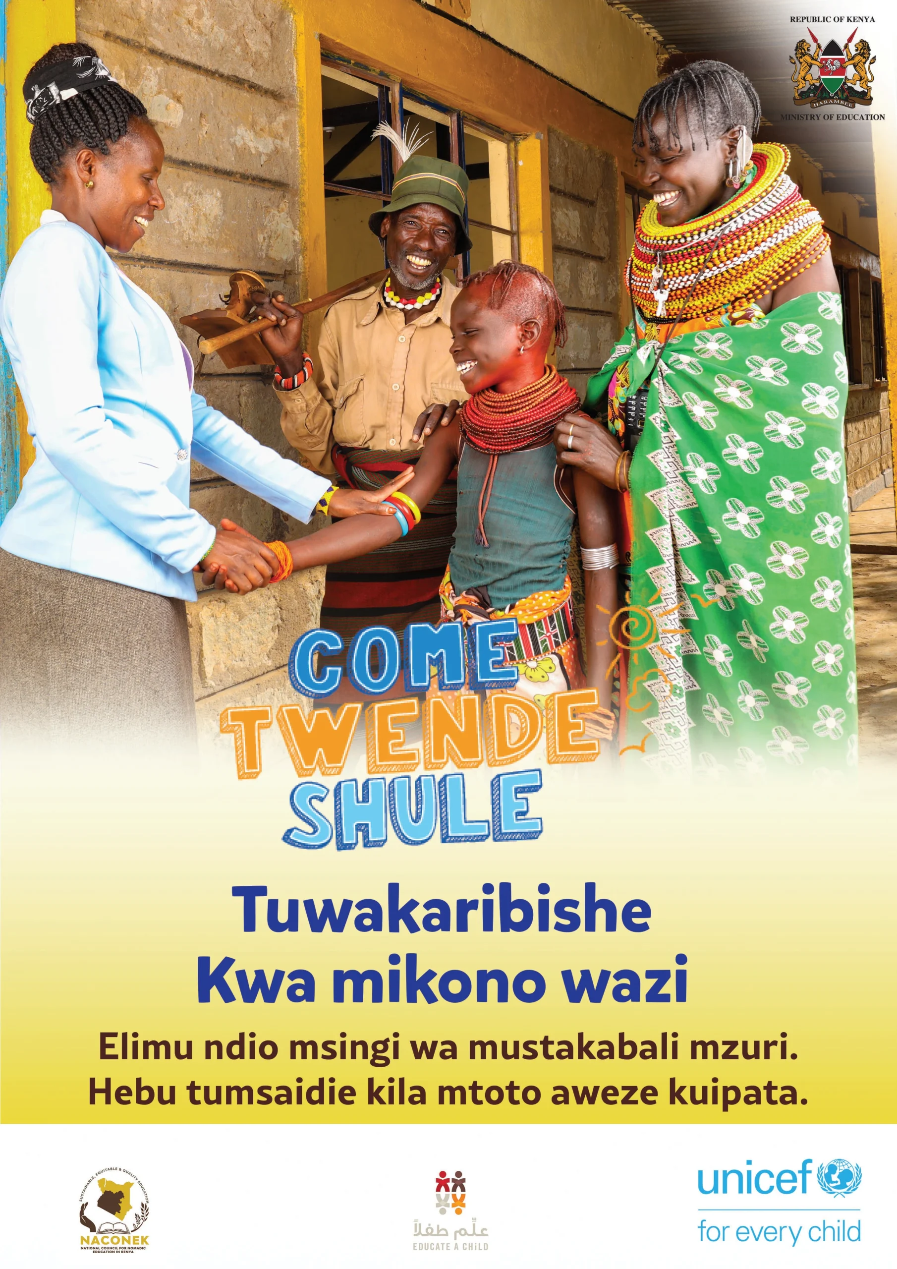 In Kenya, there is a saying, “Education is the key to life”, yet for too many children, especially in arid, marginalized, and informal settlement areas, this key remains out of reach. Poverty, long distances to schools, disability, and harmful social norms keep children, particularly girls, locked out of classrooms and denied their chance to learn, grow, and thrive. “Come Twende Shule,” meaning Come, Let’s Go to School, reframes schooling as both a right and a shared responsibility, calling on parents, teachers, community leaders, and government to unite in bringing back out-of-school children. At its heart, it speaks to the vision where every child, has a fair chance of attending school and unlocking their potential. Beyond the numbers, Come Twende Shule is shifting community mindsets. Parents are beginning to see education not as a burden, but as an investment in their children’s future. Communities feel renewed ownership of local schools, while children express pride in being part of the movement. This campaign was spearheaded by UNICEF in close collaboration with the Ministry of Education, County Governments, CBCC and partners.
