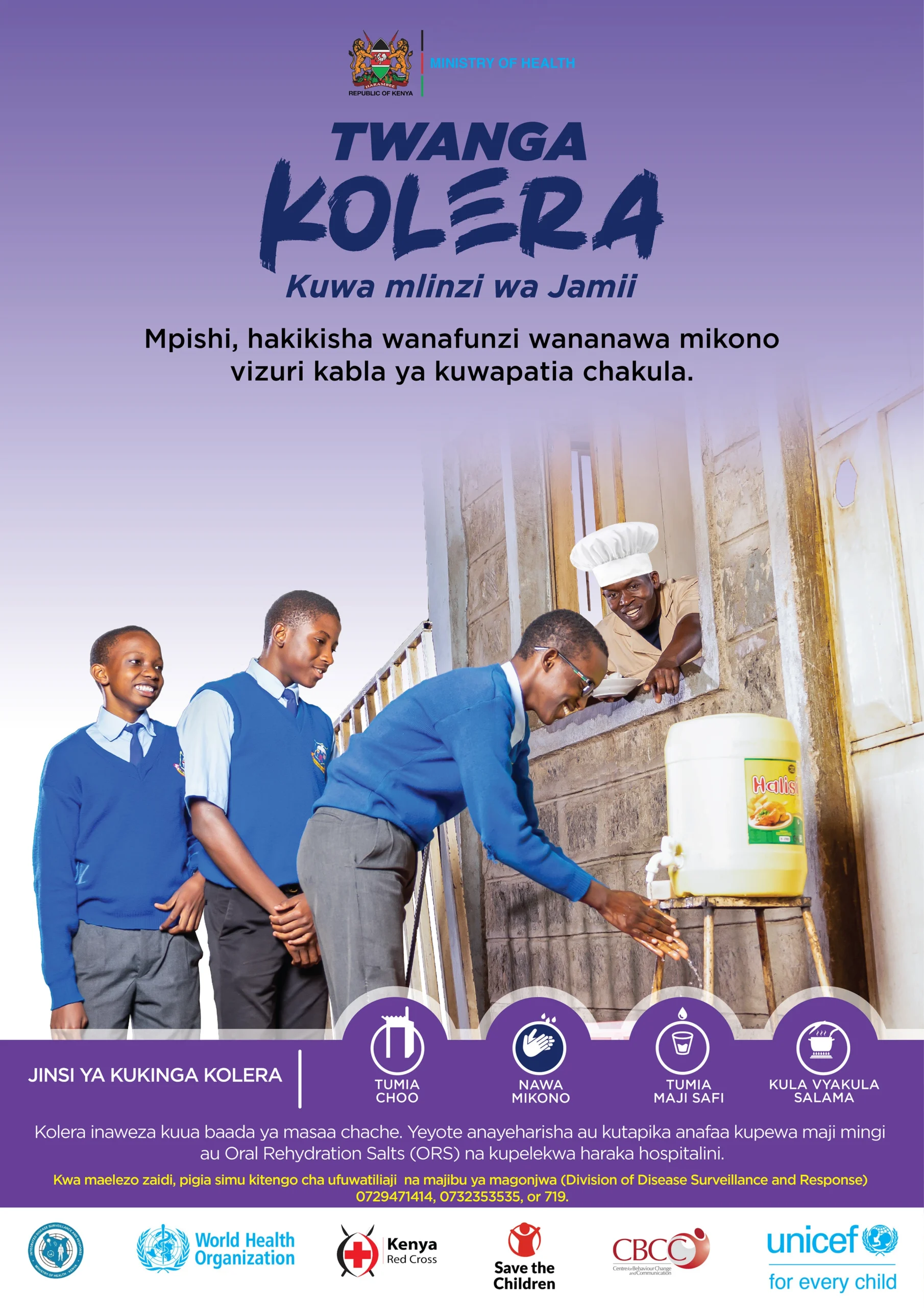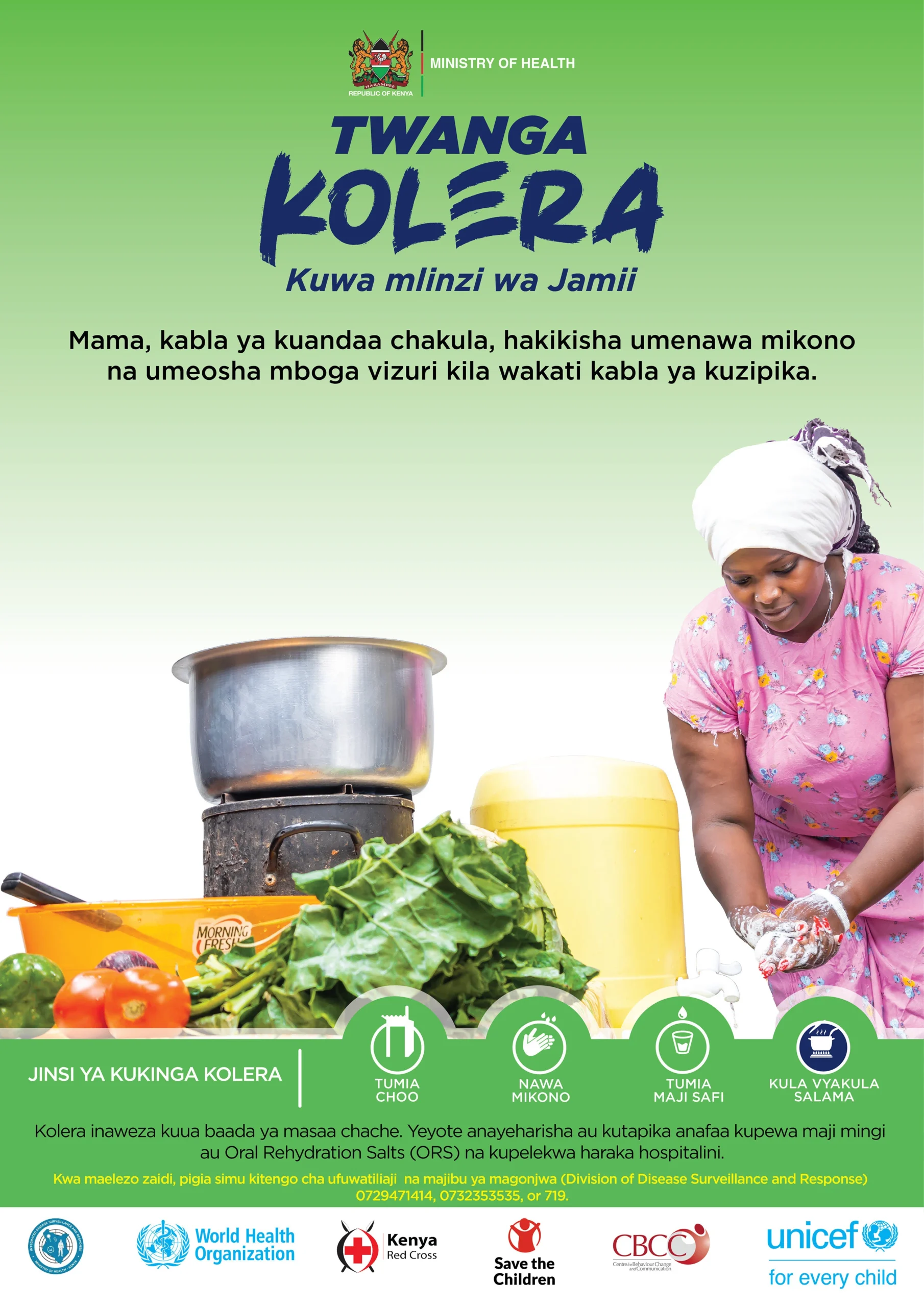 Twanga Kolera, Kuwa Mlinzi wa Jamii (Protect Yourself, Family, and Community) is a unified, empowering call to action against cholera. This nationwide campaign encourages everyone to adopt practical, everyday hygiene behaviours as routine, such as using toilets, washing hands with soap, treating drinking water, eating safe food, and getting vaccinated. Twanga Kolera avoids blame and stigma by targeting all communities equally, regardless of class or past outbreaks. Messaging is positive and confidence-building, helping people feel capable of reducing risk in their homes and environments. Rather than associating hygiene solely with disease, the campaign promotes it as a pillar of dignity, health, and community care. It positions every action as protective, not just of oneself, but of loved ones and neighbours too. By rooting messaging in local languages, daily realities, and shared responsibility, Twanga Kolera becomes more than a campaign: it’s a movement for community-powered health and resilience. The campaign is funded by UNICEF and implemented by CBCC in partnership with Ministry of Health and other partners.